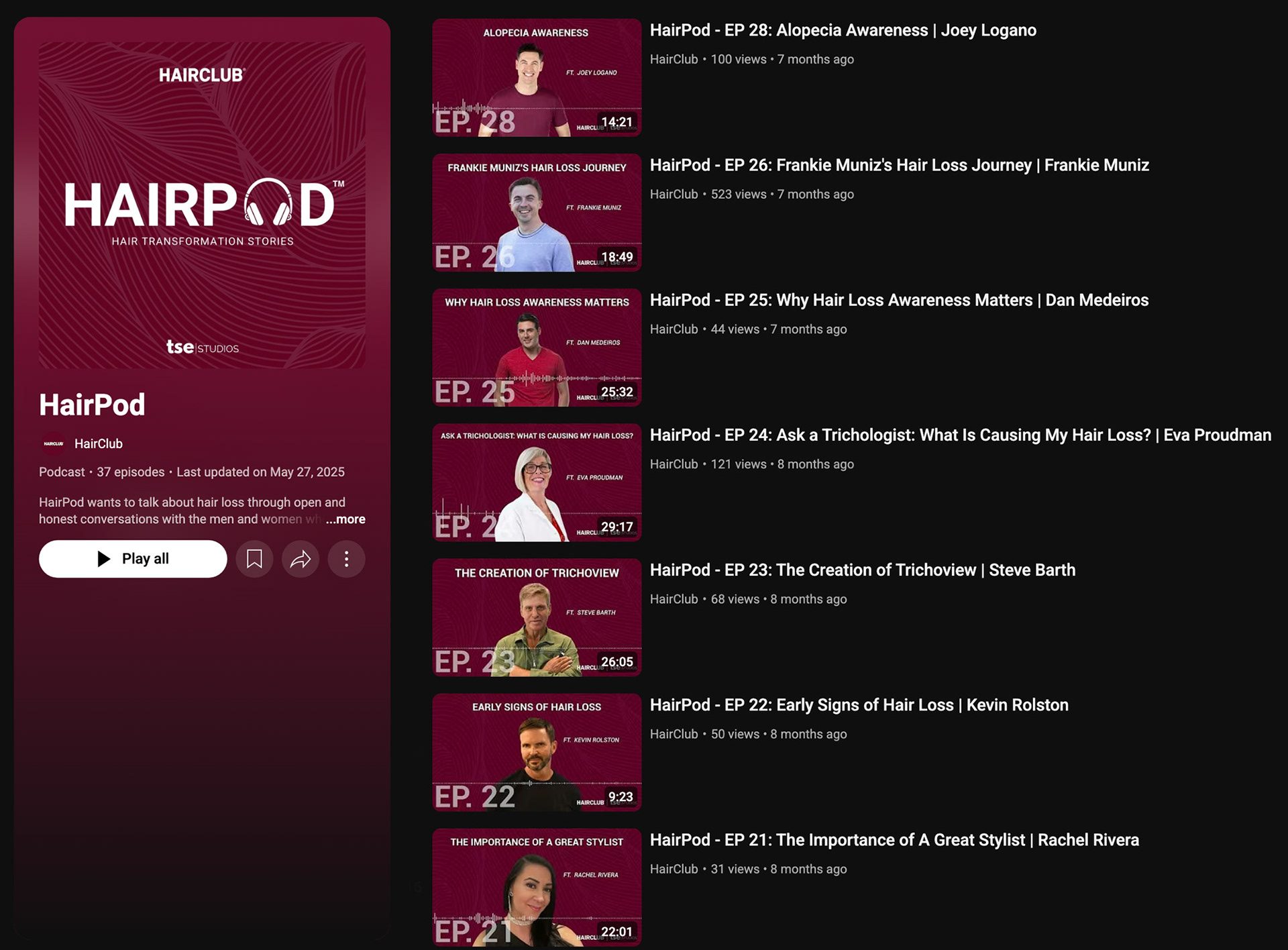 Youtube thumbnail design for HairClub's HairPod podcast episodes.